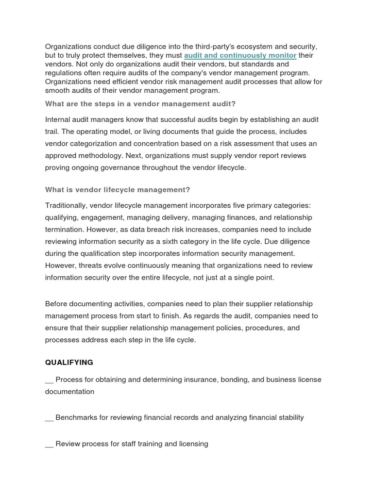 The head of procurement on a sample basis will review the vendor. A core component of any organizational risk management program is vendor management and monitoring. Provides guidance to business units regarding policy interpretation expectations to comply with the third party/vendor risk policy and standards and regulatory requirements. Internal audit will periodically sample the service contracts to ensure compliance. Vendor risk management with complianceshield.